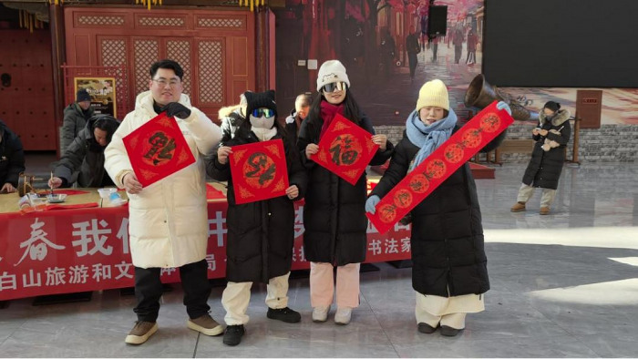 活动期间,志愿者在一旁贴心协助抻纸、晾干、递送,将带着墨香的祝福逐一送到游客手中。来自五湖四海的游客接过春联后纷纷表示,在长白山观赏冰雪美景的同时,能收到手写春联,既深切感受到中华传统文化的独特魅力,也真切体会到长白山浓厚的年味与温情。